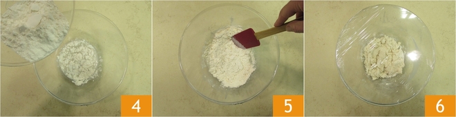 Fügen Sie dann das Mehl hinzu 4 und mischen Sie mit einem Spatel 5, bis eine homogene Masse entsteht. Bedecken Sie die Schüssel mit Frischhaltefolie 6.