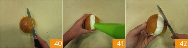 Schneiden Sie die Maritozzi seitlich ein 40, drücken Sie reichlich Sahne hinein 41 und glätten Sie sie mit einem Spatel 42.