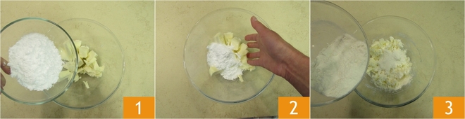 Um den leckeren Kuchen mit Schokoladenmousse zuzubereiten, beginnen Sie mit dem Crumble. Geben Sie die weiche Butter in eine Schüssel, fügen Sie den Puderzucker hinzu 1 und beginnen Sie, mit den Händen zu kneten 2. Fügen Sie dann das Mehl hinzu 3.