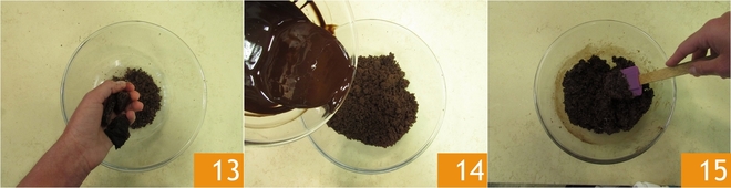 Bröseln Sie den Crumble in einer Schüssel 13, fügen Sie die Öl- und Schokoladenmischung hinzu 14 und mischen Sie mit einer Spachtel 15.