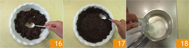 Übertragen Sie die Mischung in eine Tortenschale mit einem abnehmbaren Rand von 22 cm 16 und drücken Sie sie mit der Rückseite eines Löffels fest, sodass Sie sowohl den Boden als auch die Ränder auskleiden 17. Stellen Sie sie in den Kühlschrank, um fest zu werden. Gehen Sie nun dazu über, die Eier zu pasteurisieren, die für die Mousse benötigt werden. Gießen Sie 100 g Zucker und Wasser in einen kleinen Topf 18. Schalten Sie die Heizung ein und messen Sie die Temperatur mit einem Thermometer, es sollte 121°C erreichen.