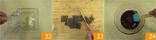 In der Zwischenzeit die Gelatine in kaltem Wasser einweichen 22. Hacken Sie die Schokolade grob 23 und schmelzen Sie sie in der Mikrowelle oder über einem Wasserbad 24.