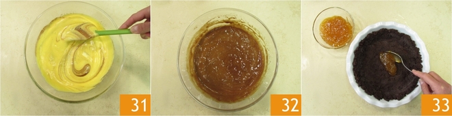 Rühren Sie vorsichtig von unten nach oben 31, bis alles eingearbeitet ist. Die Mousse ist fertig 32. Holen Sie die Basis aus dem Kühlschrank und bestreichen Sie den Boden mit der zuvor ausgesiebten Aprikosenkonfitüre 33.