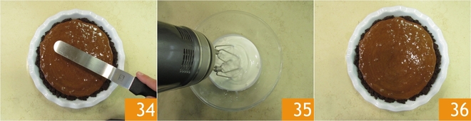 Füllen Sie die Mousse hinein und glätten Sie sie mit einer Spachtel 34. Decken Sie sie mit Frischhaltefolie ab und stellen Sie sie für mindestens 6 Stunden in den Kühlschrank. Nach dieser Zeit nehmen Sie die Sahne aus dem Kühlschrank und schlagen sie halb steif 35, wenn Sie möchten, mit Puderzucker. Nehmen Sie den mittlerweile festen Kuchen aus dem Kühlschrank und entfernen Sie die Frischhaltefolie 36.