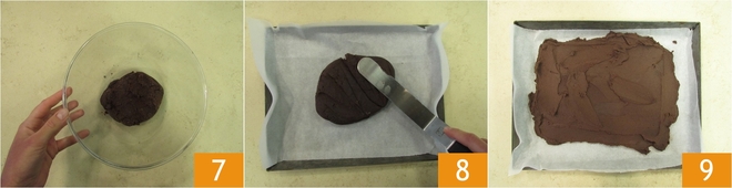 Sie sollten eine homogene, aber weiche Masse erhalten 7. Übertragen Sie sie in eine mit Backpapier ausgelegte Form und glätten Sie sie mit einer Spachtel 8 bis zu einer Dicke von 1 cm 9.