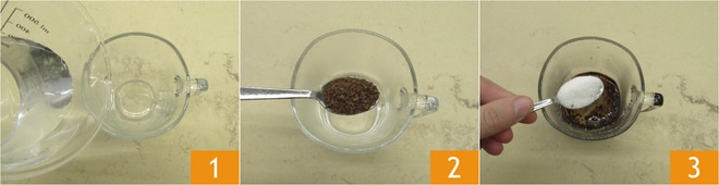 Um den leckeren Kaffee mit Sahne zuzubereiten, erhitzen Sie das Wasser 1 und lösen Sie darin einen Teelöffel Instantkaffee 2 und zwei Teelöffel Zucker 3 auf.