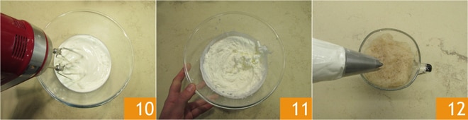 Schlagen Sie die flüssige Sahne mit einem elektrischen Mixer 10, bis sie fest ist 11, und geben Sie sie dann in einen Spritzbeutel mit Sterntülle. Spritzen Sie die Sahne auf den Kaffee 12.