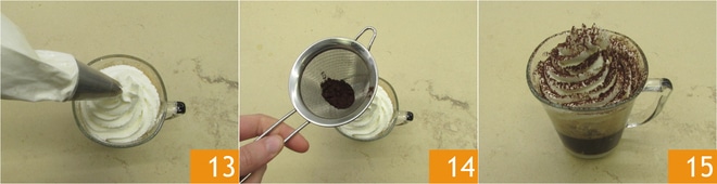 Sie sollten einen schönen Klecks erzeugen, der die gesamte Oberfläche bedeckt 13. Nun bestreuen Sie den Kaffee mit Kakao 14 und servieren Sie Ihren leckeren Kaffee mit Sahne sofort 15.