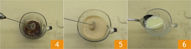 Schäumen Sie mit einem Milchaufschäumer 4, bis sich ein Schaum bildet 5. Geben Sie in der Tasse separat die Kondensmilch hinzu 6.