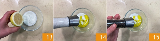 Bereiten Sie die Joghurtsauce vor: Geben Sie in eine Schüssel den Naturjoghurt und fügen Sie den Zitronensaft hinzu 13, einen Schuss Öl, eine Prise Salz 14 und eine Prise Pfeffer 15.