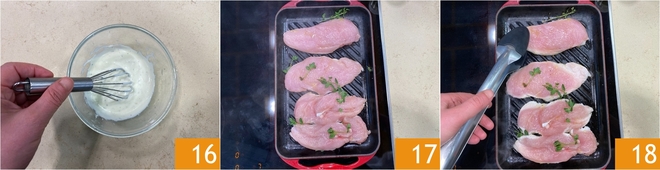 Rühren Sie kräftig mit einem Schneebesen, bis Sie eine glatte und samtige Creme erhalten 16. Nehmen Sie nun das Hähnchen wieder: Erhitzen Sie den Grill gut und legen Sie die marinierten Filets darauf 17. Braten Sie sie bei starker Hitze etwa fünf Minuten pro Seite und drehen Sie sie mit einer Zange um 18.