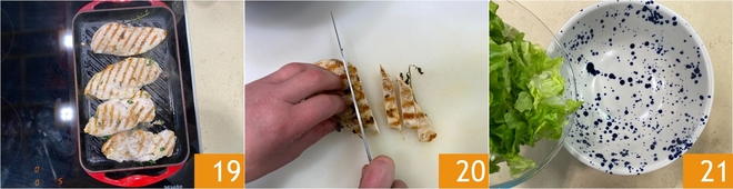Wenn sie gut gebräunt sind und die typischen Grillstreifen haben 19, reduzieren Sie die Hitze leicht und setzen Sie das Garen für weitere zehn Minuten fort, drehen Sie sie gelegentlich um. Sobald sie gar sind, lassen Sie sie abkühlen und schneiden Sie sie in gleichmäßige Streifen 20. Jetzt können Sie Ihren Salat zusammenstellen: Legen Sie den Salat auf den Boden einer großen Schüssel 21.