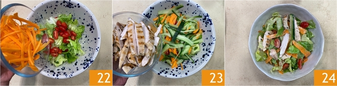 Fügen Sie die Kirschtomaten und die Karotten hinzu 22, dann auch die Gurke. Schließlich vervollständigen Sie mit dem in Streifen geschnittenen gegrillten Hähnchen 23. Ihr leichter Hähnchensalat ist servierfertig 24, würzen Sie ihn nach Belieben mit der Joghurtsauce.