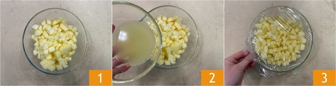 Um den leichten Kuchen zuzubereiten, legen Sie zunächst die Apfelwürfel in eine Schüssel 1, fügen Sie den Zitronensaft hinzu 2 und mischen Sie. Vakuumieren Sie das Ganze zu 100 % oder decken Sie es alternativ mit Folie ab 3 und lassen Sie es 2 Stunden im Kühlschrank marinieren.