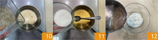 Erhitzen Sie den Likör und fügen Sie die abgetropfte Gelatine hinzu 10; gut umrühren, um sie aufzulösen, dann den Zucker hinzufügen und warten, bis er vollständig aufgelöst ist. Gießen Sie die Mischung in eine Schüssel, in die Sie bereits den Joghurt gegeben haben 12.