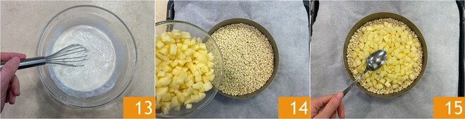Stellen Sie die Schüssel in eine andere Schüssel mit Eis; rühren Sie mit einem Schneebesen 13, bis Sie eine homogene Mischung erhalten. Das Eis hilft, die Creme schneller zu gelieren. Nehmen Sie nun den Boden aus dem Kühlschrank und verteilen Sie die Äpfel gleichmäßig darauf 14, wobei Sie ein paar cm vom Rand frei lassen 15.