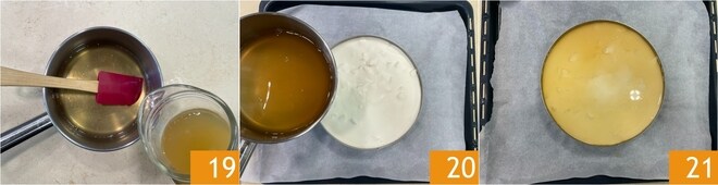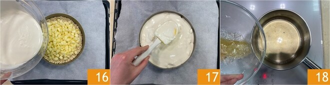 Gießen Sie auch die Joghurtcreme darüber 16 und glätten Sie sie 17. Stellen Sie sie für eine halbe Stunde in einen Schockfroster oder Gefrierschrank, um sie zu festigen. Wenn der Kuchen fest ist, können Sie das Gelee zubereiten. Wie zuvor weichen Sie es in kaltem Wasser ein und lösen es in den 40 ml heißem Likör auf 18.