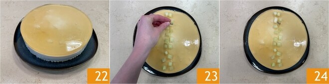 Entfernen Sie nun den Ring 22 und dekorieren Sie mit Apfelwürfeln und grünem Kardamom 23. Stellen Sie ihn bis zum Servieren in den Kühlschrank 24.