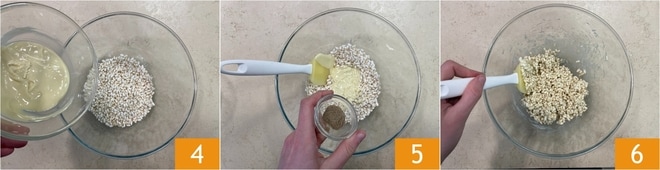 In der Zwischenzeit bereiten Sie den Boden vor. Geben Sie den Puffreis in eine Schüssel und fügen Sie die geschmolzene weiße Schokolade hinzu 4, die nicht über 35 °C sein sollte. Fügen Sie den Kardamom hinzu 5 und mischen Sie 6.