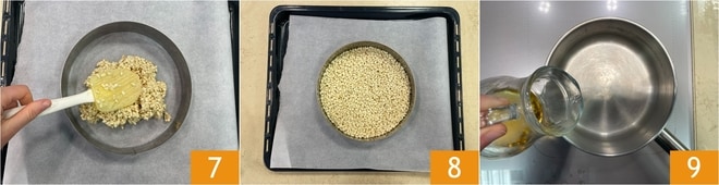 Platzieren Sie einen 22 cm-Ring auf einem mit Backpapier ausgelegten Blech und geben Sie die Puffreis-Mischung hinein 7. Glätten Sie es gut mit einem Spatel 8 und lassen Sie es 30 Minuten im Kühlschrank fest werden. In der Zwischenzeit bereiten Sie die Creme vor. Zuerst weichen Sie die Gelatine in kaltem Wasser ein, dann geben Sie die 50 ml Calvados in einen kleinen Topf 9.