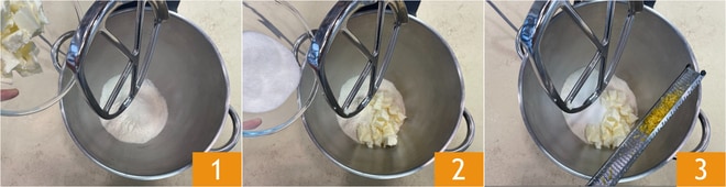 Um die Lemon Pie zuzubereiten, bereiten Sie zunächst den Mürbeteig zu, den Sie entweder von Hand oder mit Hilfe einer Küchenmaschine kneten können. Geben Sie das Mehl in die Schüssel der Küchenmaschine, fügen Sie die Butter 1, den Zucker 2 und den abgeriebenen Zitronenschalen 3 hinzu.