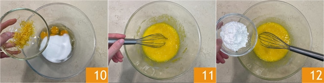 Fügen Sie die abgeriebene Zitronenschale hinzu 10 und mischen Sie gründlich, um alle Zutaten zu verbinden 11. Geben Sie dann die Maisstärke hinzu 12.