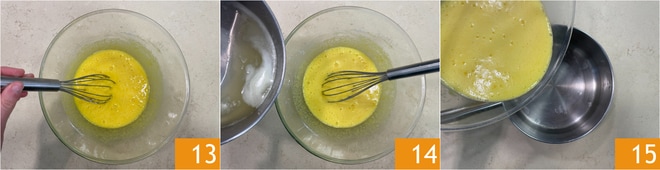 Mischen Sie erneut 13 und fügen Sie den Zitronensaft in zwei Schritten hinzu 14, dabei kontinuierlich rühren. Übertragen Sie die Mischung in den Topf 15.