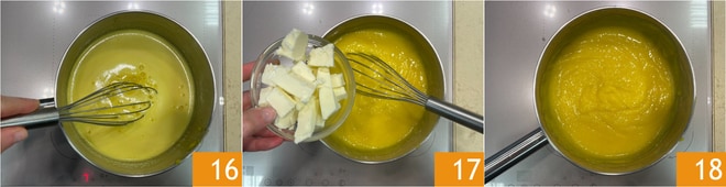 Rühren Sie weiter 16, bis die Mischung zum Kochen kommt. Nehmen Sie den Topf vom Herd und fügen Sie die Butter hinzu 17, rühren Sie erneut, bis sie vollständig geschmolzen ist 18, und lassen Sie sie dann abkühlen, indem Sie sie in eine Schüssel umfüllen.