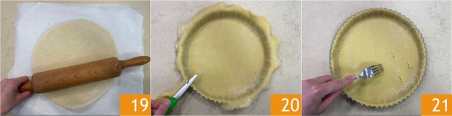 Nehmen Sie den Mürbeteig heraus und rollen Sie ihn mit einem Nudelholz aus 19, um ihn nicht zu stark zu erhitzen und kein Mehl zu verwenden, können Sie diesen Vorgang mit Backpapier durchführen. Mit dem Mürbeteig eine Tortenform mit 24 cm Durchmesser auslegen und den Überschuss entfernen 20. Stechen Sie den Boden mit einer Gabel ein 21. Stellen Sie die Form in den Kühlschrank und lassen Sie sie weitere 30 Minuten ruhen.