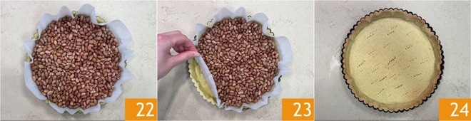 Nehmen Sie die Form heraus, legen Sie das Innere mit Backpapier aus und geben Sie trockene Bohnen hinein 22. Backen Sie im statischen Ofen bei 170°C für 15 Minuten. Entfernen Sie die Bohnen und das Backpapier 23 und backen Sie den Boden erneut im statischen Ofen bei 160°C für 15 Minuten, lassen Sie ihn vollständig abkühlen 24.