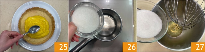 Geben Sie den Lemon Curd auf den Boden 25, glätten Sie ihn mit der Rückseite eines Löffels und lassen Sie ihn dann 12 Stunden im Kühlschrank ruhen. Nach dieser Zeit können Sie sich an die Zubereitung des italienischen Baisers machen. Gießen Sie in einen kleinen Topf Wasser und 150 g Zucker 26 und bringen Sie es auf eine Temperatur von 121°C. In die Schüssel der Küchenmaschine die Eiweiße geben, 50 g Zucker hinzufügen 27 und steif schlagen.