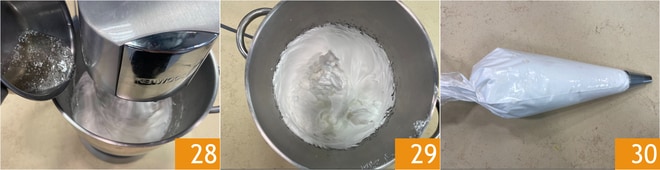 Ohne die Maschine anzuhalten, den Zuckersirup in einem dünnen Strahl 28 hinzufügen und schlagen, bis das italienische Baiser nicht mehr heiß und stabil bleibt 29. Füllen Sie es in einen Spritzbeutel 30.