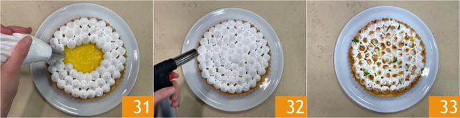 Nehmen Sie den Boden mit dem Lemon Curd aus dem Kühlschrank und garnieren Sie ihn mit dem italienischen Baiser 31, flambieren Sie es mit einem Bunsenbrenner 32 und dekorieren Sie es mit ein paar Minzblättern und abgeriebener Zitronenschale. Die Lemon Pie ist bereit, genossen zu werden 33.
