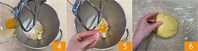 Fügen Sie ein Ei 4 und eine Prise Salz 5 hinzu und kneten Sie mit dem Rührhaken, bis Sie einen glatten und homogenen Teigball erhalten. Wickeln Sie ihn in Frischhaltefolie 6 und lassen Sie ihn 30 Minuten im Kühlschrank ruhen.