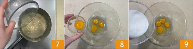 In der Zwischenzeit bereiten Sie den Lemon Curd vor. Pressen Sie die Zitronen aus, Sie erhalten etwa 120 g Saft. Gießen Sie ihn in einen Topf 7 und bringen Sie ihn zum Kochen. In einer Schüssel die Eier und das Eigelb aufschlagen 8, fügen Sie den Zucker hinzu 9.
