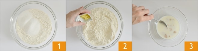 Um die Zitronenrollen zuzubereiten, schmelzen Sie zuerst die Butter und lassen Sie sie abkühlen. Sieben Sie das Mehl in eine Schüssel, dann fügen Sie den Zucker 1 und die abgeriebene Zitronenschale 2 hinzu. In einer separaten kleinen Schüssel lösen Sie die Hefe in etwas von der gesamten Milchmenge auf 3.