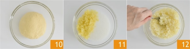 Sie sollten einen elastischen und homogenen Teig erhalten 10. Zu diesem Zeitpunkt legen Sie den Teig zurück in die Schüssel, decken Sie ihn mit Frischhaltefolie ab und lassen Sie ihn bei Raumtemperatur etwa 2 Stunden gehen oder bis das Volumen sich verdoppelt hat. In der Zwischenzeit bereiten Sie die Füllung vor, indem Sie Zucker mit der abgeriebenen Zitronenschale in einer Schüssel mischen 11 12. Schmelzen Sie die Butter und lassen Sie sie abkühlen.