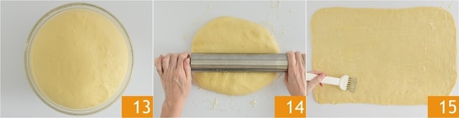 Nach der Gehzeit 13 rollen Sie den Teig auf der leicht bemehlten Arbeitsfläche aus 14, bis Sie ein Rechteck von etwa 48x35 cm erhalten, und bestreichen Sie es mit der geschmolzenen Butter 15.