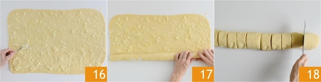 Verteilen Sie die Zucker-Zitronen-Mischung gleichmäßig auf der gesamten Oberfläche 16, dann rollen Sie das Rechteck vorsichtig von der längeren Seite her auf 17. Schneiden Sie die entstandene Rolle in 12 Stücke, die jeweils etwa 4 cm breit sind 18.