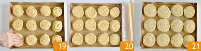 Legen Sie Backpapier in eine Form von 30x20 cm und platzieren Sie die Röllchen darin, wobei Sie sie etwa 2 cm voneinander entfernt platzieren. Drücken Sie sie dann leicht mit der Handfläche an 19. Decken Sie die Form mit Frischhaltefolie ab und lassen Sie sie etwa 30 Minuten bei Raumtemperatur gehen 20. Nach dieser Zeit backen Sie die Zitronenrollen in einem vorgeheizten statischen Ofen bei 180° für etwa 30 Minuten 21, wobei das Blech im mittleren Teil des Ofens platziert wird.