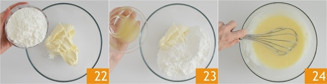 In der Zwischenzeit bereiten Sie die Glasur für die Abdeckung vor, indem Sie den Frischkäse zusammen mit dem Puderzucker 22, der Schale und dem Saft der Zitrone 23 in eine Schüssel geben. Mischen Sie, bis Sie eine homogene Mischung erhalten 24, dann stellen Sie sie für 30 Minuten in den Kühlschrank.