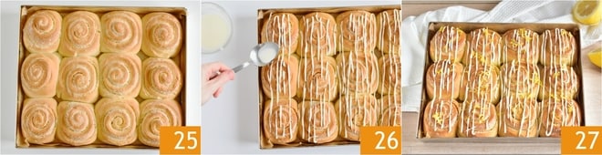 Wenn die Zitronenrollen schön goldbraun an der Oberfläche sind, nehmen Sie sie aus dem Ofen und lassen Sie sie vollständig abkühlen 25, danach können Sie sie mit der Glasur garnieren 26. Bestreuen Sie die Oberfläche mit weiterer abgeriebener Schale nach Belieben und Ihre Zitronenrollen sind bereit zum Genießen 27!