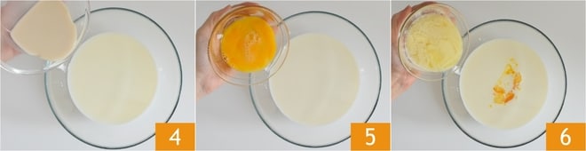 Gießen Sie die Mischung aus Milch und Hefe in die restliche Milch 4, dann fügen Sie das verquirlte Ei 5 und die geschmolzene, abgekühlte Butter 6 hinzu.
