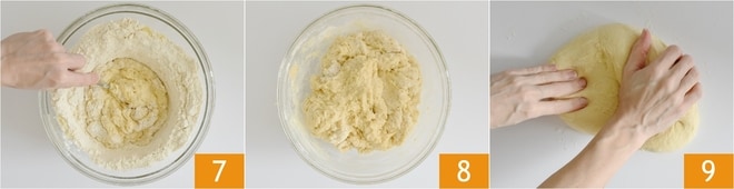 Fügen Sie die flüssigen Zutaten zu den trockenen hinzu und beginnen Sie mit einem Löffel zu mischen 7. Wenn die Zutaten gut vermischt sind 8, legen Sie die Mischung auf die Arbeitsfläche und kneten Sie sie etwa 10 Minuten lang 9.