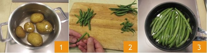 Um den ligurischen Hackbraten zuzubereiten, waschen Sie zunächst die Kartoffeln gründlich und lassen Sie sie dann für 40 Minuten in kaltem Wasser kochen 1; kochen Sie sie, bis sie weich sind, indem Sie mit den Zinken einer Gabel hineinstechen, die Zeit kann je nach Größe der Kartoffeln variieren. Waschen und trimmen Sie die grünen Bohnen 2, und kochen Sie sie dann separat in einem Topf mit Wasser für etwa 25 Minuten 3, ebenfalls in kaltem Wasser beginnend. Sie sollten am Ende des Kochvorgangs zart sein, ohne zu zerfallen.