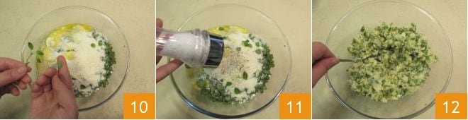 Würzen Sie mit den Blättern von Majoran 10, dann salzen 11 und pfeffern Sie. Mischen Sie alles gut 12 und stellen Sie es beiseite.