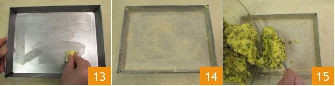 Fetten Sie nun eine rechteckige Form von 30x23 cm ein 13 und bestreuen Sie den Boden und Rand mit Semmelbröseln 14. Geben Sie die Mischung in die Form 15,