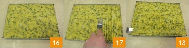 glätten Sie die Oberfläche mit der Rückseite eines Löffels oder einer Spachtel, um sie gleichmäßig zu verteilen 16, dann machen Sie nach Belieben die typischen Dekorationen, indem Sie zunächst die Zinken der Gabel vertikal 17 und dann horizontal ziehen, um ein Streifenmuster zu erzeugen 18.