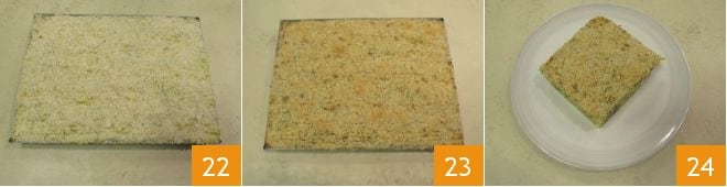 Nun geben Sie den geriebenen Parmesan und die Semmelbrösel in eine Schüssel 19, mischen Sie 20 und verteilen Sie die Mischung auf der Oberfläche 21.