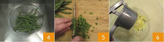 Sobald die grünen Bohnen fertig sind, lassen Sie sie abtropfen 4 und schneiden Sie sie in kleine Stücke 5. Inzwischen sind auch die Kartoffeln gar, lassen Sie sie abtropfen und drücken Sie sie durch eine Kartoffelpresse, um das Püree in einer großen Schüssel aufzufangen 6.